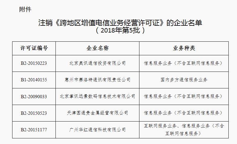 经审核,工业和信息化部认为北京奥讯通信投资有限公司等5家企业符合退出电信业务市场条件,根据《电信业务经营许可管理办法》第三十一条规定,现注销其相关跨地区增值电信业务经营许可证。