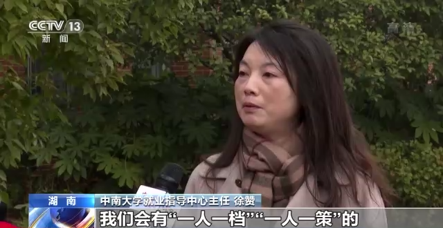 中南大学就业指导中心主任 徐赞:学校聚焦重点群体,分类施策进行精准帮扶,我们会有“一人一档”“一人一策”的这种精准帮扶,会提供专人帮扶、定点岗位推荐。比如说我们会为家庭经济困难的学生提供求职困难补助,会为在心理、身体还有求职能力等等方面有短板的同学提供这种心理上的帮扶,同时也会有针对性的求职能力训练的课程和项目的安排。
