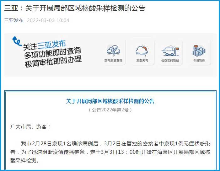 据三亚发布微信公众号消息,3月3日,三亚市新型冠状病毒肺炎疫情防控工作指挥部发布关于开展局部区域核酸采样检测的公告(2022年第2号)。
