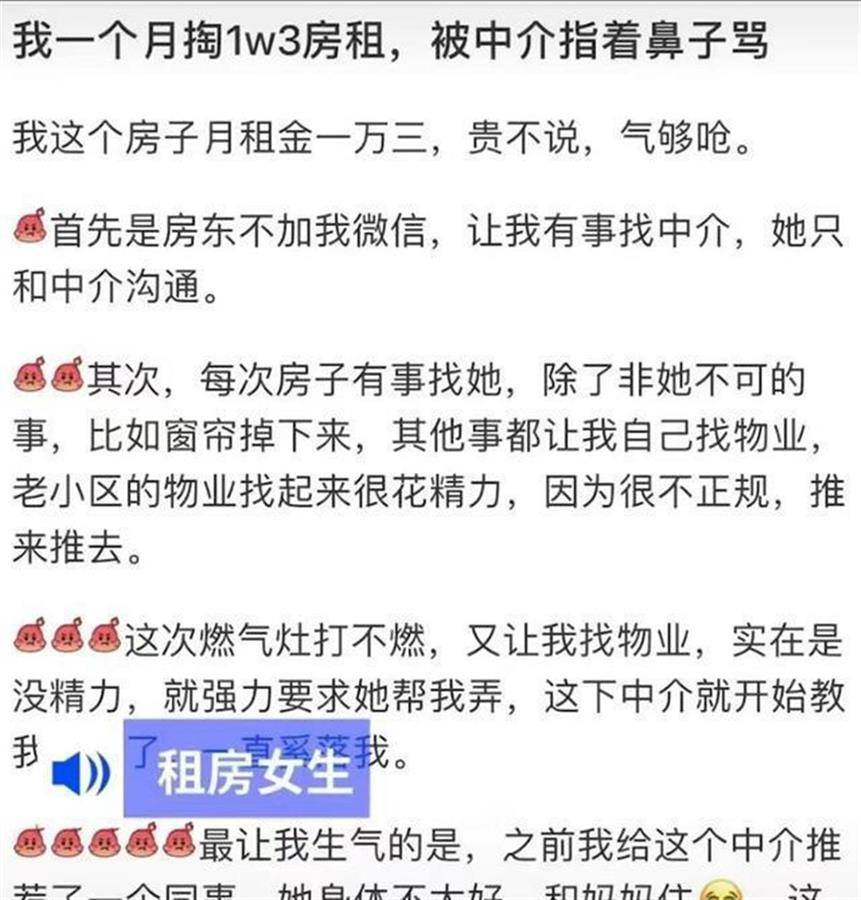 再者,该名女生的房东不与租客直接联系,有事就让她找中介,这个流程就不怎么正规。按理说,正规中介只是为出租人和承租人牵线搭桥,提供一些手续上的服务,让交易更加规范、更合法。租房合同签了之后,这事跟中介就没关系了,哪有一直跟着传话的?事后也证明,该中介就是私人中介,或许跟房东也是私人关系。这样的话,中介很难中立客观,承租人的权益就得不到周全的保障。