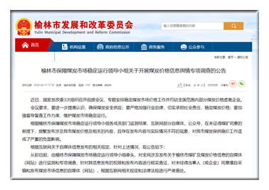 据榆林市发展和改革委员会官网消息,2月17日,榆林发改委发布榆林市保障煤炭市场稳定运行领导小组关于开展煤炭价格信息舆情专项调查的公告。